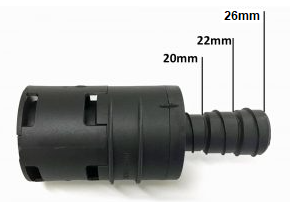 Combustion air inlet silencer with user selectable hose fitting sizes allowing the unit to be screwed onto the end of the inlet of either 20mm, 22mm or 26mm I/D hose. This makes it idea for use with the HS2000, HS2211, HS2000E, HS2800 and Whale Heatair 3G, 4G, 5G heaters.